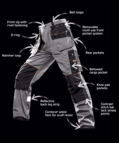 Removable multi-use front pocket system including. ID pass pocket. Contrast stitch bar tack stress points. Bellowed cargo and rear pockets. Front zip with rivet fastening. Reflective back leg strip. Belt and hammer loops. Cordura® ankle hem. Knee pad pockets. Belt loops. D-rings. Co-ordinated X-OVER range. Generous fit. Tough and hardwearing look for on- and off-site wear. Reinforced ankle hem for scuff resist.