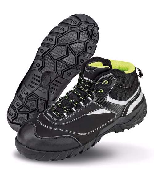 This breathable, water resistant high top safety boot blends protection and style with ease. S3 classification, anti static and SRC slip resistance along with scuff cap and reflective details combine to bring you the next generation of RESULT's safety footwear choices. In a classic black nubuck leather with understated green flashes you can feel safe and secure in the Blackwatch! Conforms to EN 20345:2011 S3 SRC.