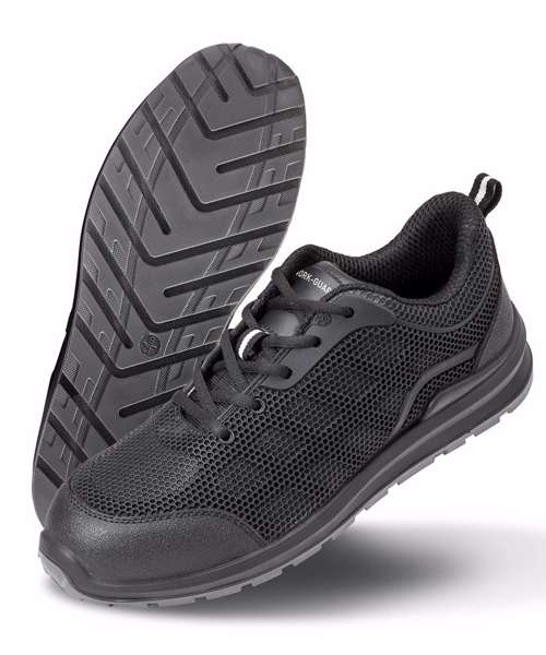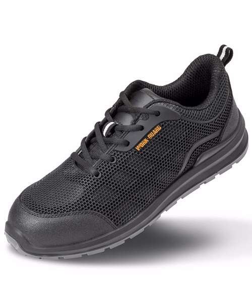 CE EN 20345:2011 SRA SB. Breathable. Durable. Lightweight. Low cut sports look. Ventilating mesh and lining wicks away moisture. Injection show moulds for this style are same for men and women; size range therefore starts with women's and runs through into men's. Padded tongue and collar. Energy absorption heel. Moulded PU scruff cap. SRA slip resistance. Spare insole set. Steel toecap. Oil resistant. Heel loop.