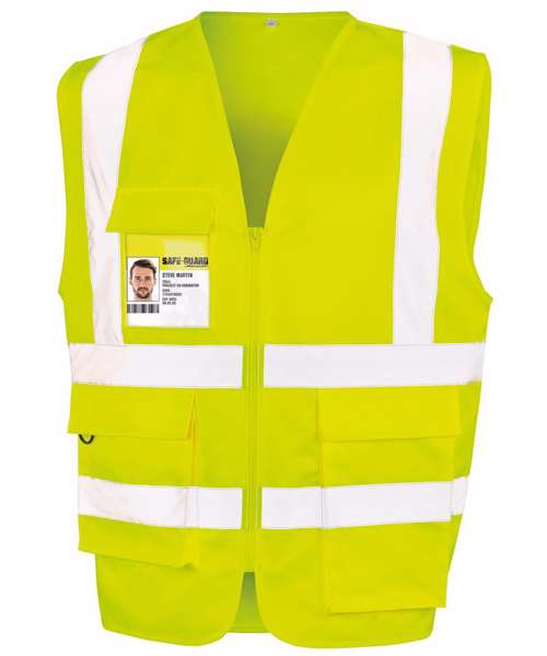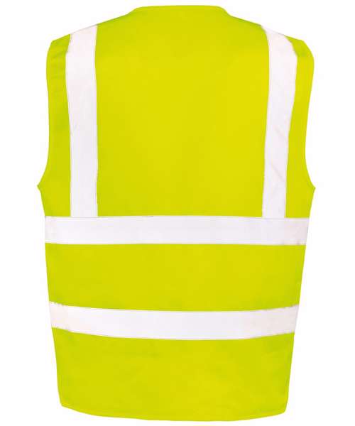 Strategic body bands for ease of decoration. Extra-length pocket suitable for testing equipment. Two tear-release patch pockets. Self-coloured bound edges. Dual pocket and ID pass. Zip close. Generous size. Hang-loop. D-ring.Yellow and Orange: UK 2019 S1696 Schedule 35 Regulation 38 UKCA RIS-3279-TOM Issue 2 2019 (Orange only). Black & Navy: EN17353:2020 Type B3 (Enhanced visibility for night use only).
