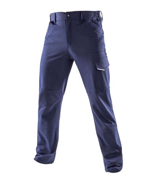 Soft-feel, wrinkle-free stretch fabric, springs back to shape. Elastomultiester fibres' unique structure provides a recycled fabric choice and Elastomultielastane: moisture-wicking properties and increased resistance to damage lead to longer-lasting garments. 9 pockets including reinforced ruler pocket, multicompartment thigh pockets, and expandable back pockets. Trebel stitched critical seams. Side elasticated waistband with high back. Ankle scuff panel masks grime. Articulated knee zone. Zip fly with rivet. Hammer loop. Belt loops. Slim fit. Elastane-free. TPU-free.