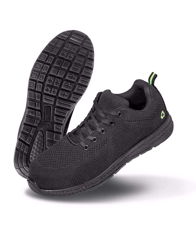 Energy absorption heel with microfibre heel scuff. Metal-free composite toecap and plastic eyelets. Ventilating mesh and lining wicks away moisture. Durable, lightweight, low-cut sports look. Dual-density PU midsole. Padded tongue and collar. SR slip resistance. Anti-static. Heel loop. Recycled polyester upper.