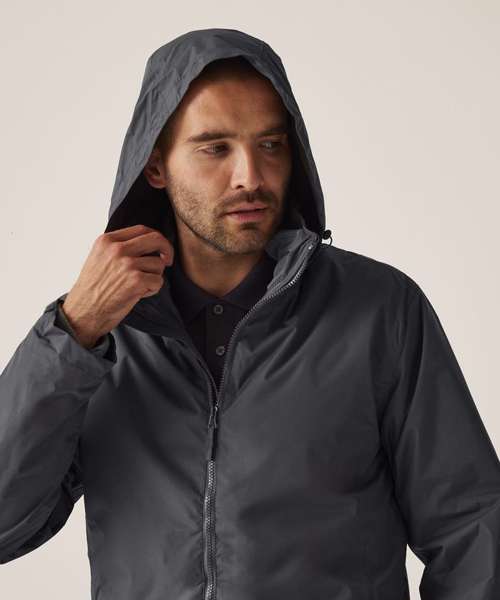 Waterproof Hydrafort 5000 peached polyester fabric. Polyester taffeta lining. Windproof fabric. Critically taped seams. (Inner) 220 series anti-pill symmetry fleece. 2 Lower pockets. (Special Features) Concealed hood with adjuster. Adjustable cuffs. 2 Zipped lower pockets. Hook and loop fastening at hem for embroidery access.