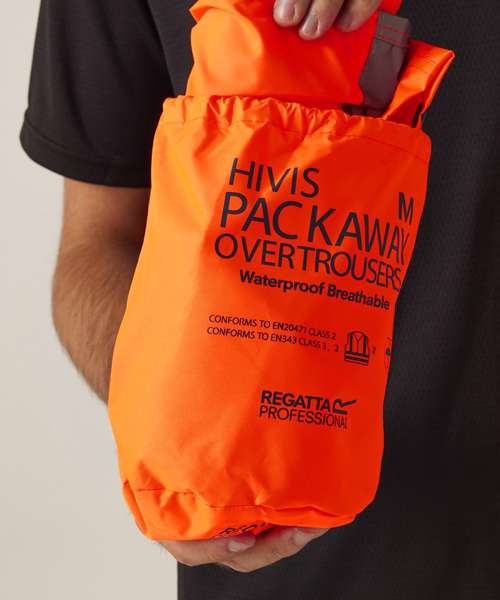 Waterproof and breathable Isotex 10000 polyester 150D Oxford fabric with taped seams, Conforms to EN343 class 3:2. Conforms to EN20471: 2013 +A1: 2016 Class 2 (trousers) (orange also RIS-3279-TOM). Quick access hip pockets and elasticated waist. Packs away into a separate bag with hanger loop for easy storage.