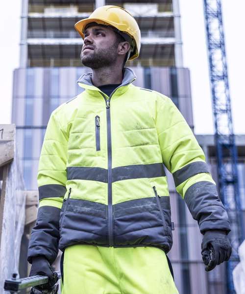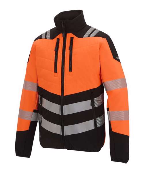 Lightweight four-way stretch fabric with a durable water-repellent finish. Warmloft insulation, 160gsm. Certified EN ISO 20471:2013 A1:2016 Class 2. Orange colourway is also certified to RIS-3279-TOM. One zipped chest pocket and two lower zipped pockets. Internal pocket. Fleece-lined collar. Stretch binding to armholes. Concealed inner zip for embroidery access. Darker contrast panels, ideal for dirty environments.