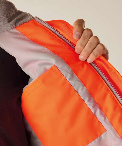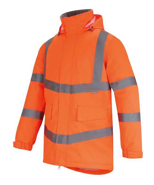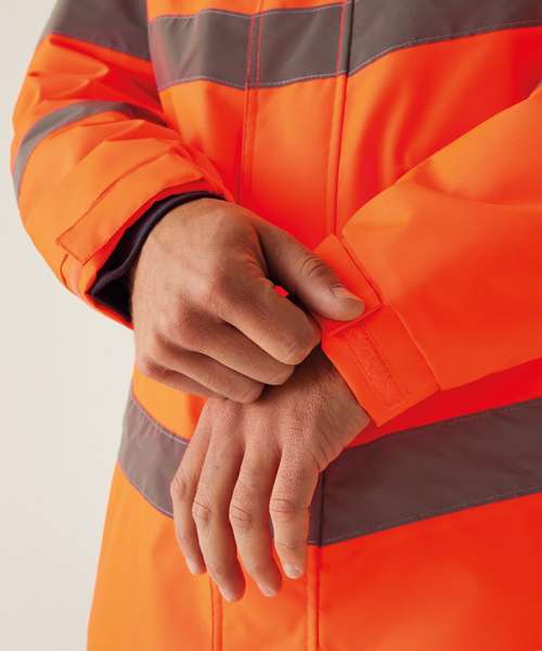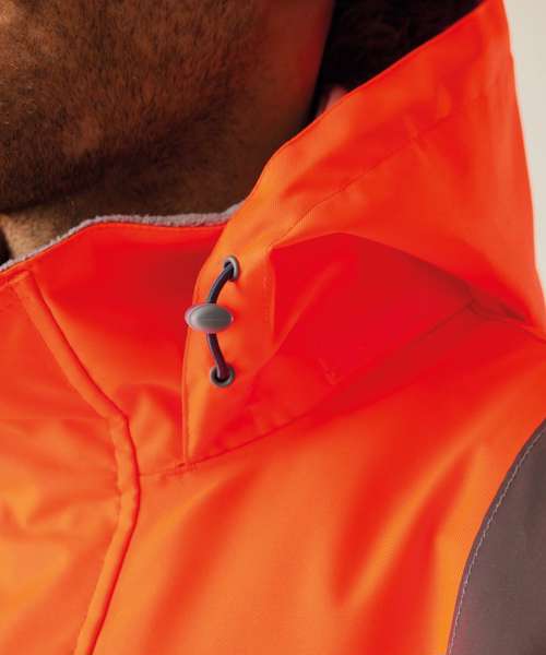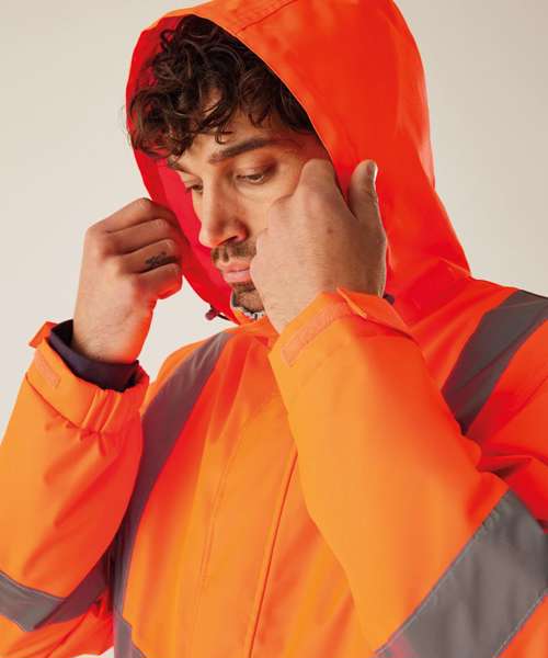 Waterproof Hydrafort 100% Polyester Oxford 300DD fabric. Medium-weight Thermoguard insulation, 100gsm. Certified to EN ISO 20471:2013 A1:2016 Class 3. Orange colourway is also certified to RIS-3279-TOM. Conforms to EN343:2019 Class 3:1. Two lower pockets. Internal pocket. Pack-away hood with adjusters. Adjustable cuffs with hook-and-loop fastening.