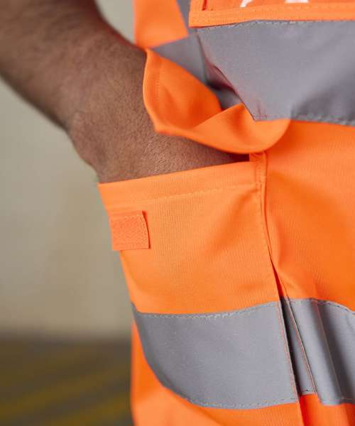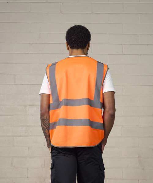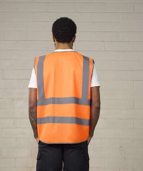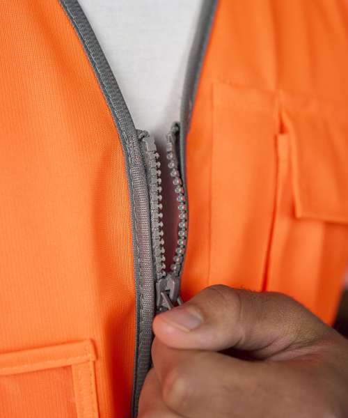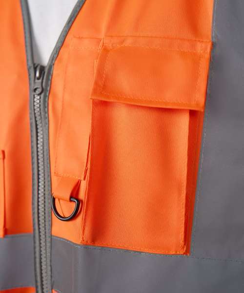 Certified EN ISO 20471:2013+A1:2016. RIS-3279-TOM ISSUE 1:2016 (Orange only). HV Orange & HV Yellow - Class 2. Two-Colour - Class 1. Full length front zip fastening. ID Card pocket. Mobile phone pocket. Key loop. Two side front expandable pockets with flaps. Over shoulder and around body reflective tapes.
