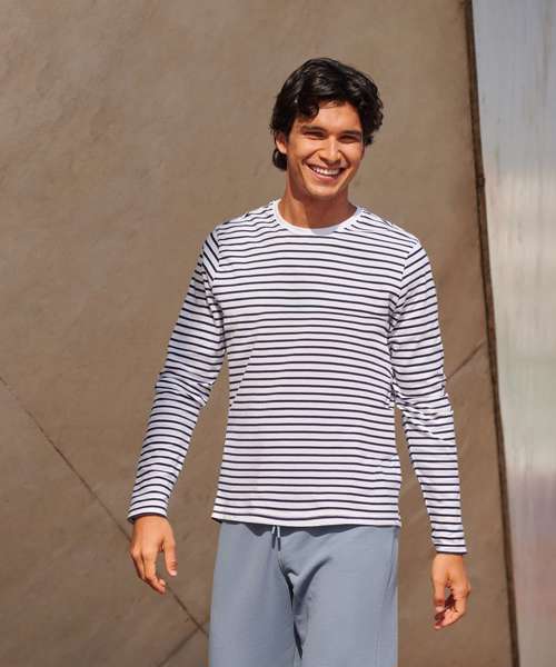 You can't go wrong with stripes. Fun. Impactful. A modern classic. Made with quality striped cotton Jersey, this soft-to-touch unisex long sleeved striped T has a regular body fit to suit all shapes. The stretch rib neck and back neck tape ensure a premium finish. The tear-out label is removable for re-branding.