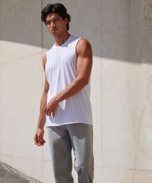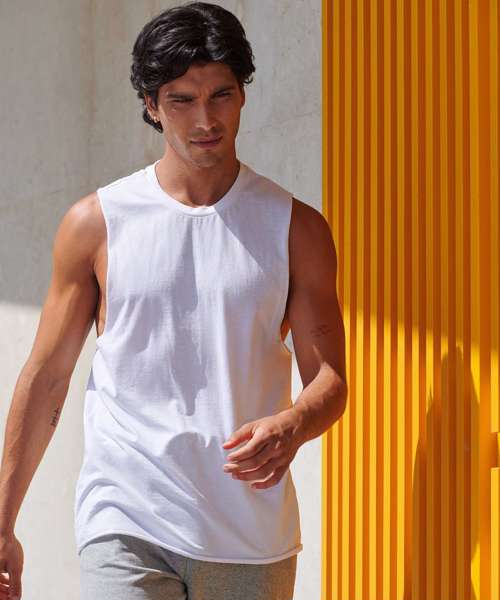 Fashion meets athleisure. Style and freedom to move with a stretchy ribbed crew neck and raw edge slash armholes and hem. Features tear-out label for easy rebranding.