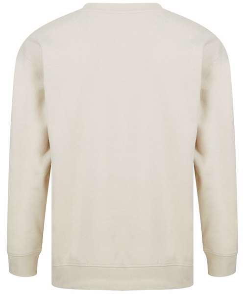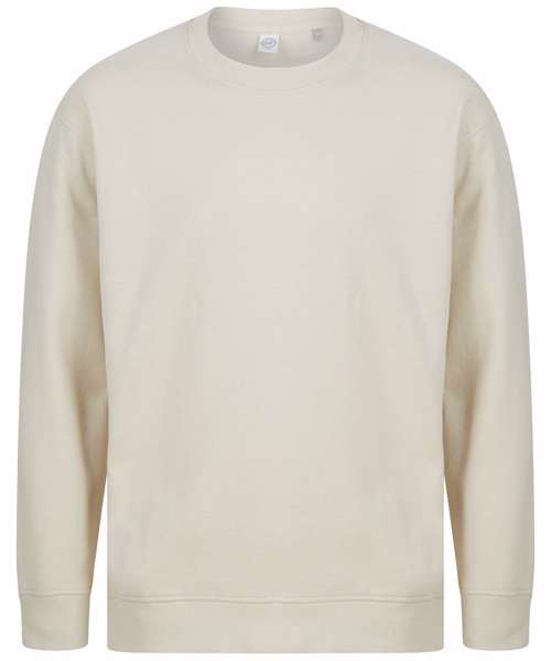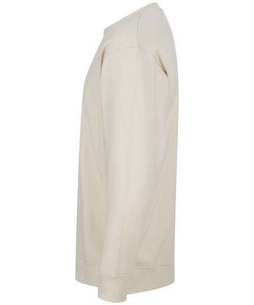 Unisex relaxed-fit sweat. Set-in sleeves, dropped shoulders. Droptail hem – curved high front, low back. Ribbed hem cuffs and crew neck. Single Jersey back neck tape and facing. Tonal topstitching detail. Brand-free, for easy rebranding. Contains recycled cotton and recycled polyester.