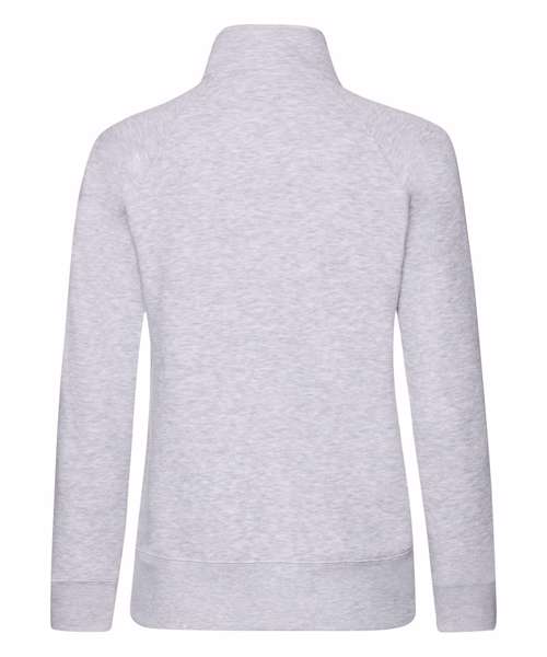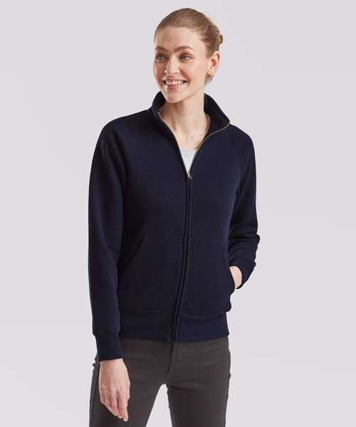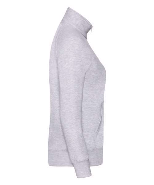 Featuring a 100% cotton face and covered metal zip for enhanced printability, the women's Premium sweat jacket is perfect for promotions, music merchandise, licensing, tourism and more. This feminine fit garment has two front pockets for multi-purpose use and a single Jersey back neck tape for comfort, while the cadet collar and cotton/elastane waist and cuff ribs provide everyday comfort and added warmth.