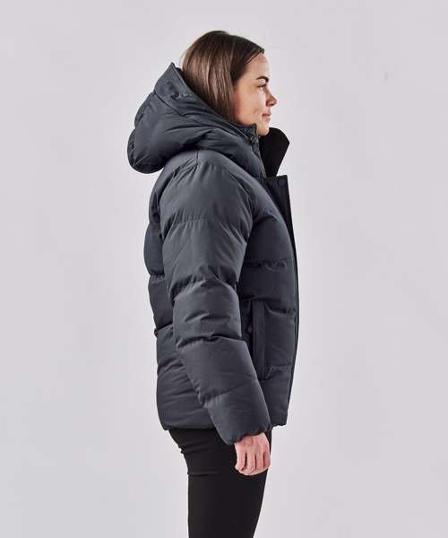 Pure Earth by STORMTECH™. STORMTECH two-layer H2XTREME® 15000/10000 waterproof/breathable outer shell. STORMTECH Thermolex™ high loft synthetic down. Durable, PFC-free, water-repellent finish. High-performance, windproof outer shell. Articulated elbows. Bomber-style length. Elastic hem and cuff trim. Ultra-warm, zipped hand pockets. Full-coverage insulated hood with face shield. Zip-off insulated hood trim, reinforced. Flexible hood opening. Internal storm flap with brushed tricot. Thermal reflective lining. Internal mesh stash pockets. Internal zipped chest pocket. Decoration access.