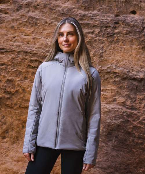 Stormtech Thermal Shell™ insulation. Durable water-repellent finish. High-performance stretch woven outer shell. Full-coverage attached hood with easy-lock adjustment. High-density brushed-back knit panels. Articulated elbows. Underarm gussets. Zipped on-seam handwarmer pockets. Single-hand hem adjustment. Partially elasticised cuffs. Contoured seaming. Contains recycled materials.