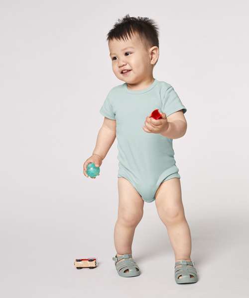 Short sleeve baby bodysuit. Set-in sleeve. 1x1 rib binding at neck collar and leg opening. Snap placket at shoulder. Snap closure at bottom.