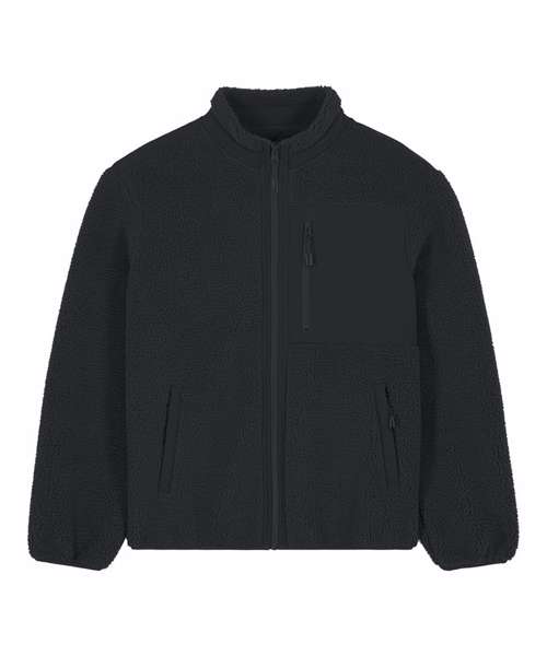 Premium unisex Sherpa jacket in 100% recycled polyester. Relaxed fit, 450gsm. Fully bonded inside fleece layer with an anti-pill finish. Contrast softshell inserts.