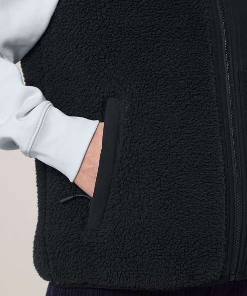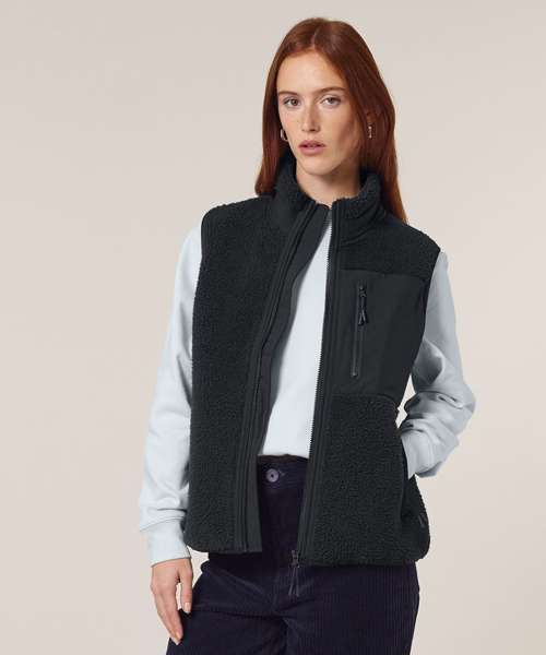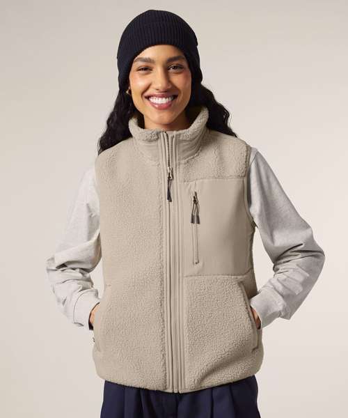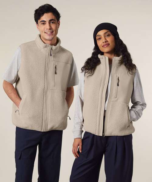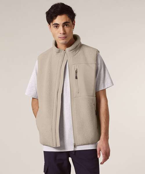 Premium, unisex, sleeveless sherpa jacket in 100% recycled polyester, 450gsm. Fully bonded inside fleece layer with an anti-pill finish. Contrast softshell inserts.
