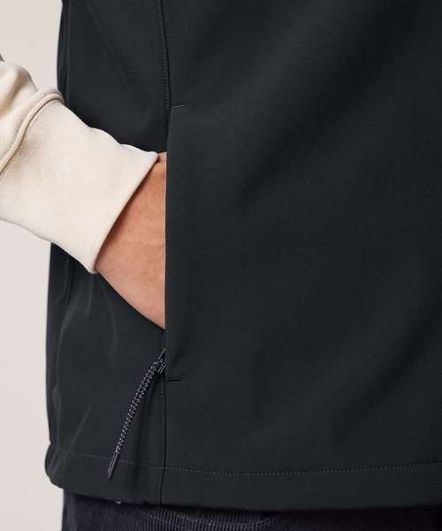 Premium men’s sleeveless softshell jacket. 315gsm stretch fabric with recycled TPU membrane and inside fleece layer. Water-repellent, breathable and windproof.