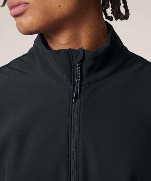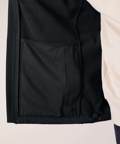 High collar. Bottom hem with adjustable plastic stopper and elastic cord. Reverse nylon zip at centre front. Zipped outside welt pockets with reflective elastic zip pull. Fully bonded inside fleece layer with anti-pilling finish. Side panels and stretch for better shape. Inside seams finished with recycled binding. Water-repellent bottom hem with adjustable plastic stopper and elastic cord. Water-repellent. Breathable and windproof.