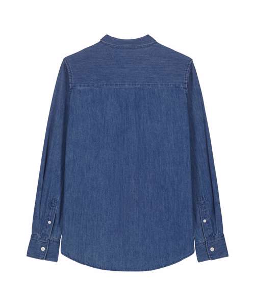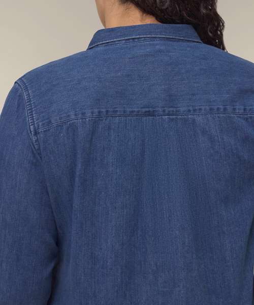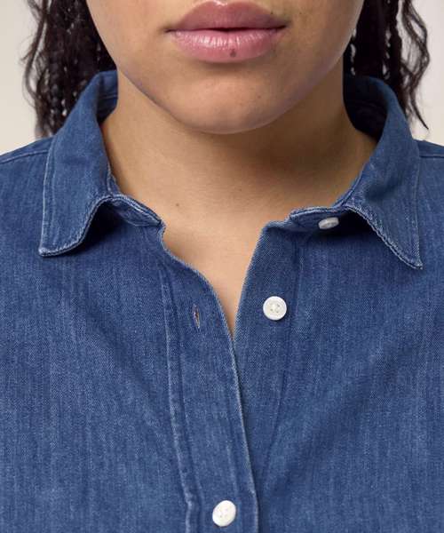 The Stella denim shirt for women. Medium fit. Point collar with single-needle topstitches. Collar stand with one contrast button. Front placket with single-needle topstitches on each side. Forwarded shoulder. Back yoke. Inside yoke in self-fabric. Set-in sleeves. Sleeve placket with one button. Cuff with two buttons. Straight cuff corners. Double pleats at cuff seam. Faded look on all seams due to garment washing – indigo yarn dyed product – so each garment may vary in appearance.