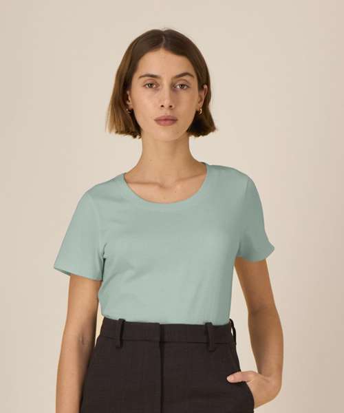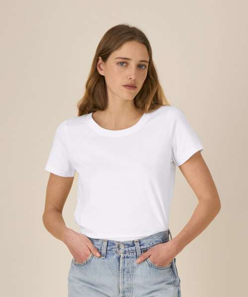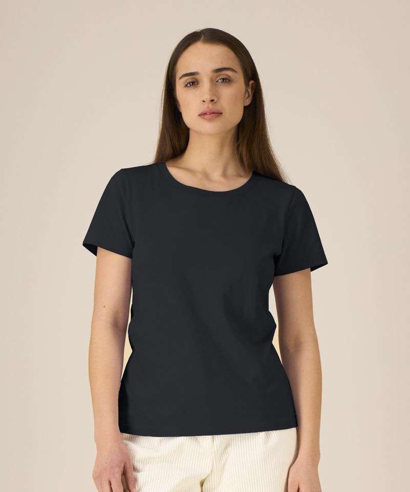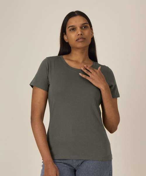 Iconic mid-light women’s t-shirt. Fitted. Set-in sleeve. 1x1 rib at neck collar. Inside back neck tape in self-fabric. Narrow twin-needle topstitch at sleeve cuff and hem.