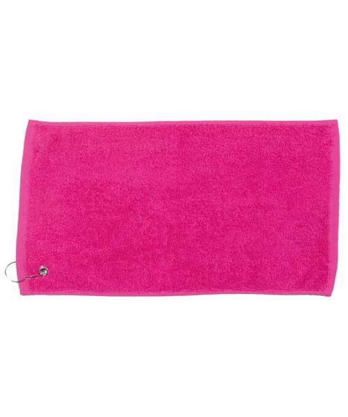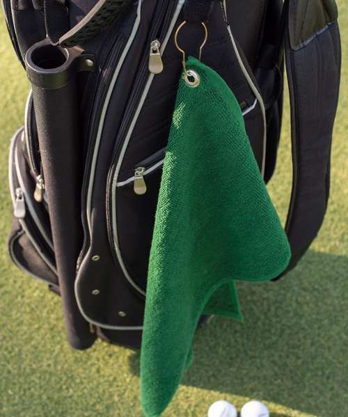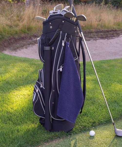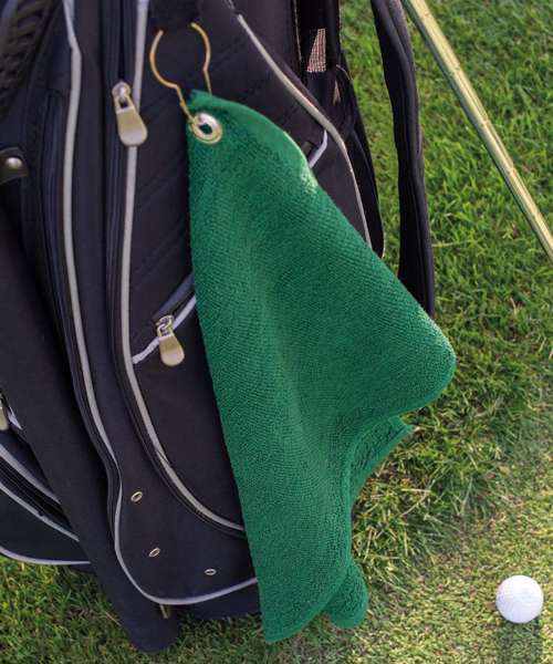 Luxury golf towel with soft, deep pile and excellent absorbency. Featuring a herringbone border with a convenient grommet and hanging loop. Available in a wide selection of popular colours.