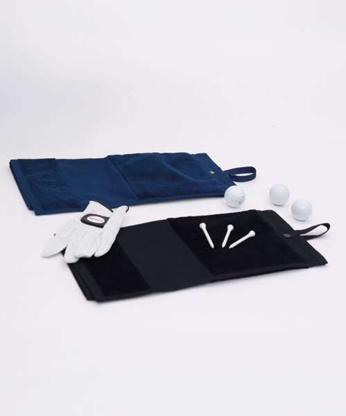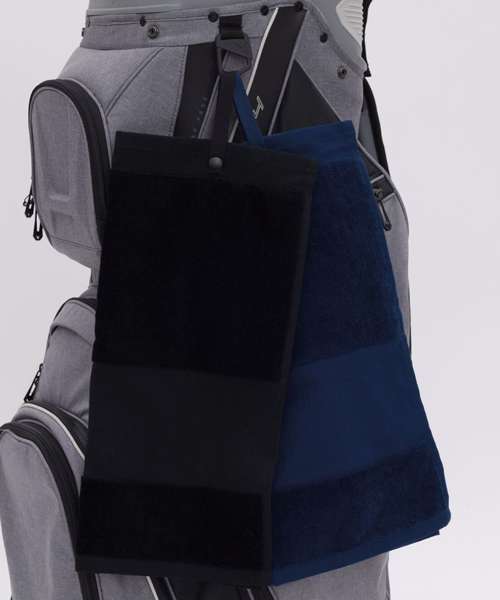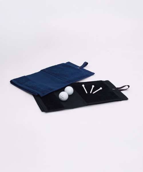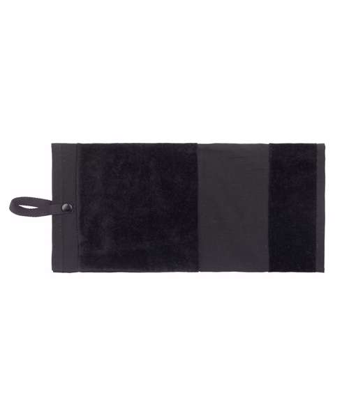 Deluxe golf towel in 100% cotton luxury velour. Trifold design. Printable border section at lower edge. Woven strap with YKK snap-and-popper fastening. Highly absorbent. Luxury feel. Tear-out label for rebranding ease.