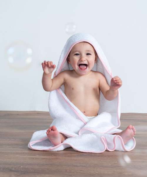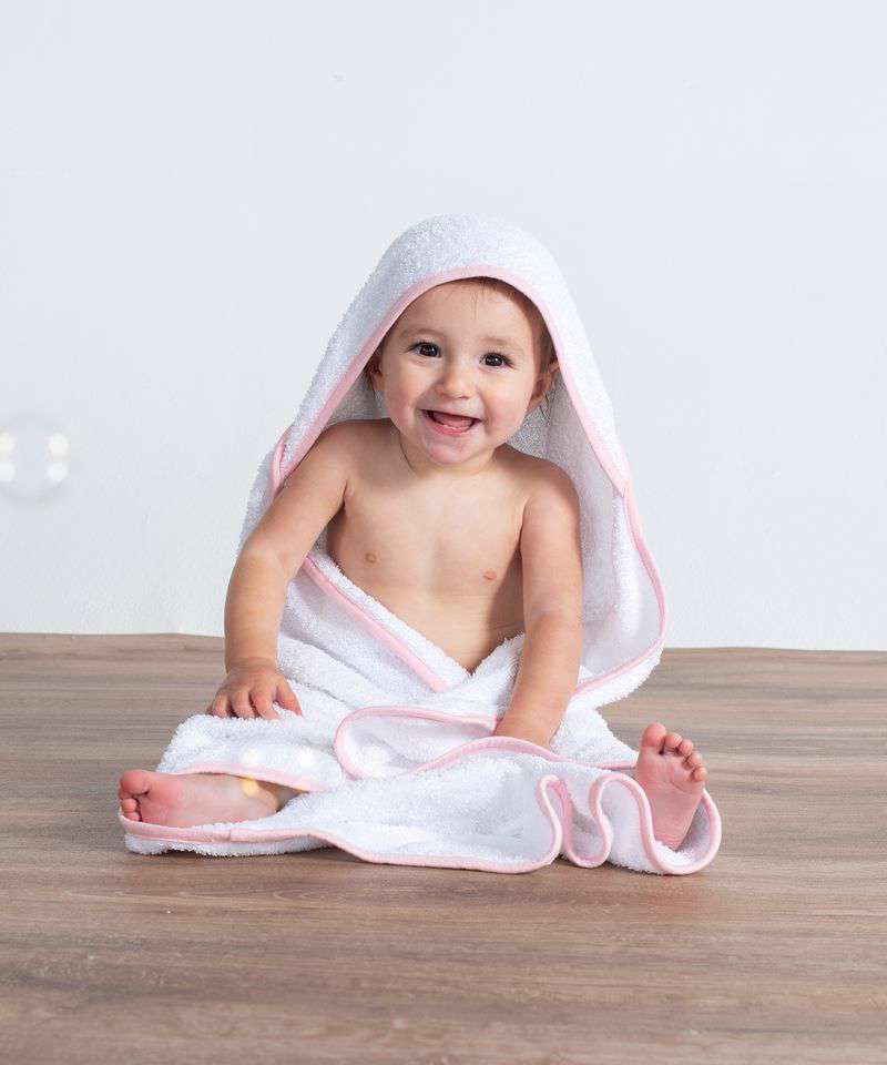 Luxury baby towel with hood. Excellent absorbency. Exceptional softness. Contrast binding.