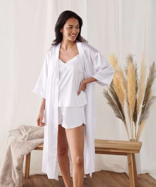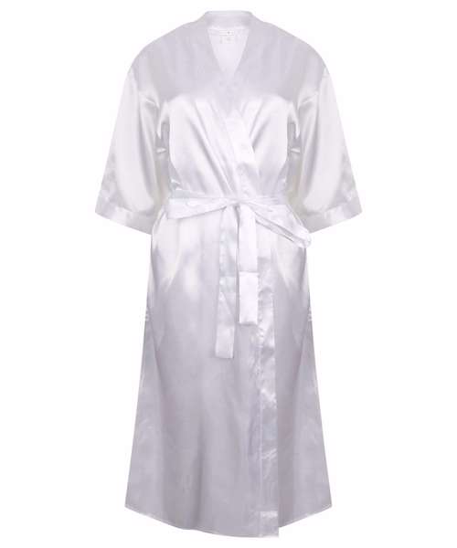 Add a little luxury to your life with this satin kimono robe. It has 3/4 length sleeves and comes just below the knee, with handy side pockets and a self-fabric tie belt. Divine!