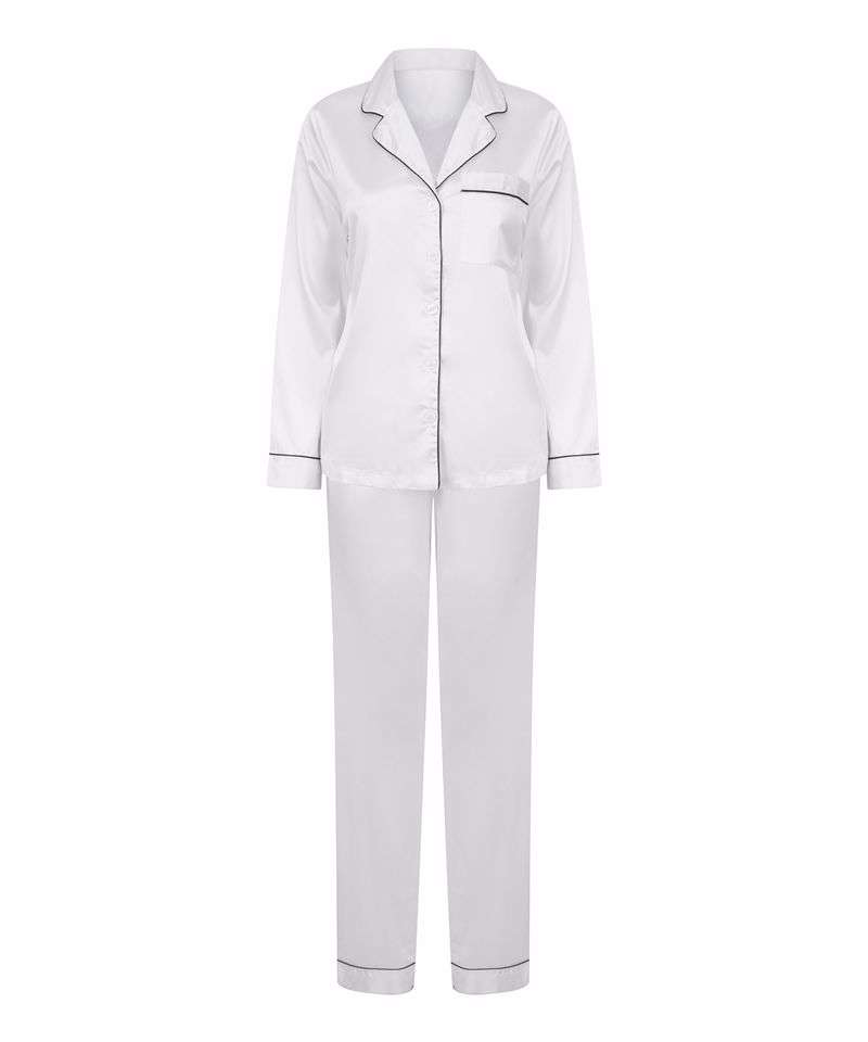 Add a little luxury to your life with this satin pyjama set. The stretch satin fabric and elasticated waistband is super comfortable with front button fastening and front breast pocket. Styling contrast piping detail.