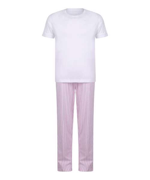 Short-sleeved t-shirt and long pant pyjama set. Crew neck t-shirt with turn up sleeves. Elasticated waistband on pants with mock herringbone drawcord.