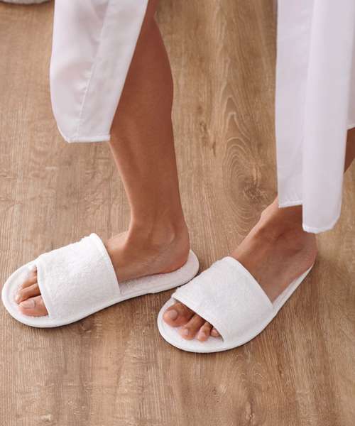 Step out in comfort with the classic open-toed mule slippers made from durable terry fabric.