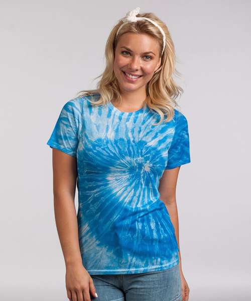 Double-needle stitched neckline and sleeves. Sublimation printed Tie-Dye pattern. Contoured silhouette with side seams. Minor white creases may appear due to the nature of sublimation printing around underarms and edges. WRAP certified.