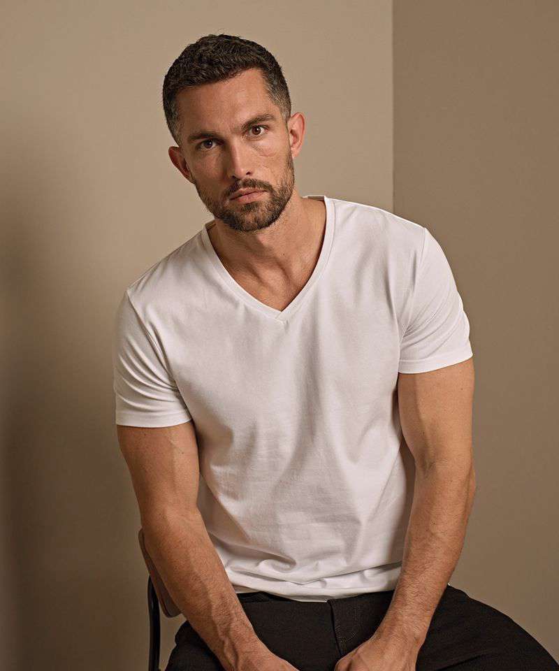The slim-fitted Stretch v-neck tee features a two-layer slim neck rib and reinforced shoulders.