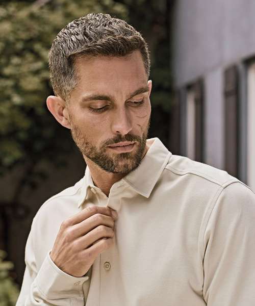 Tailored fit. Self-fabric collar. Double preshrunk. Enzyme-washed. Long fibre cotton. Mini piqué. Certified organic cotton.