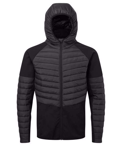 Hybrid jacket with diagonal quilted upper chest and full back. Lower jacket is shell fabric. Full zip-through style with panelled hood. Hood is elasticated for a snug fit. Front pockets. Elasticated hem. Quilted detailing to arms with lower arm in shell fabric. Internal storm flap with zip guard. We recommend using block out vinyl and inks.Product contains no branded neck or waist label. Removable Kimble or looped garment tags. Inner seam label holds important product information on one label with a second label containing brand information which can be cut-away.