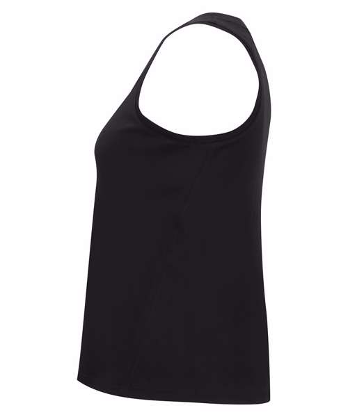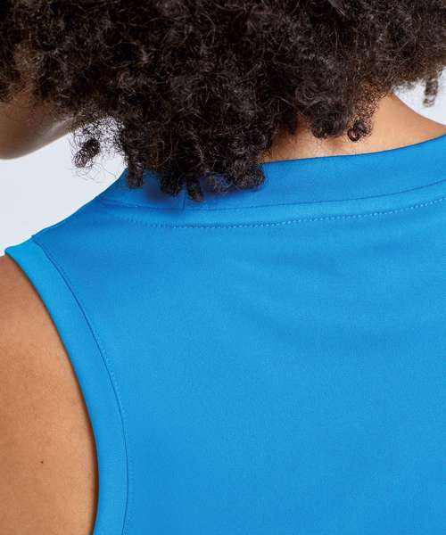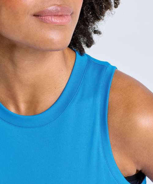 Performance tank top. Cationic-dyed. 100% certified recycled polyester. Wicking fabric. Stretch. Lightweight. Forward shoulder detail. Crew neck. Smooth finish.