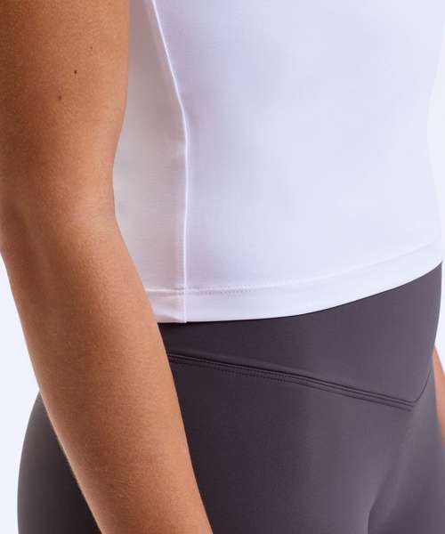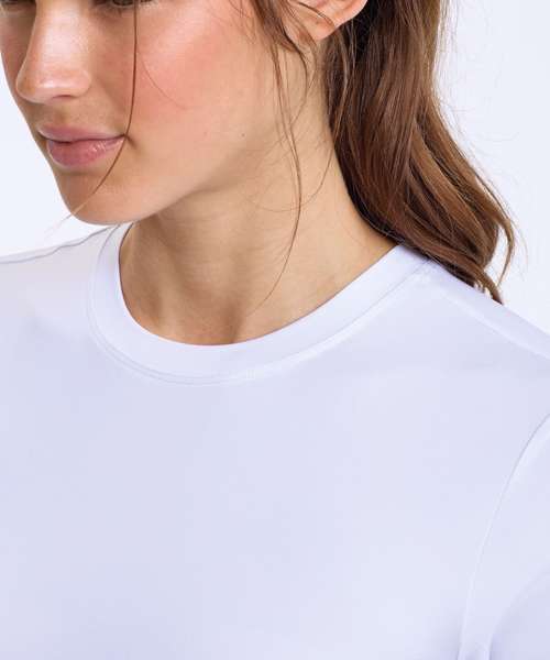 Crew neck. Short sleeves. Fitted tee. Certified recycled Polyester. Elastane. Stretch. Smooth finish.
