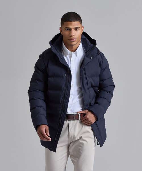 The Recycled bonded longline padded jacket is perfect for outdoor adventurers or hardworking professionals, its extended silhouette providing enhanced coverage to offer versatility across a range of activities. Packed with features designed to retain heat, it includes a detachable hood that easily adjusts to changing weather conditions. With its professional finish and bonded baffle design, this jacket is both stylish and smart.