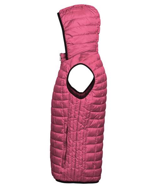 Contrast coil zip on centre front with signature zip puller and mouse tail piping on each side of zip opening. Front and back square stitched baffles with linear side narrow baffles. 250gsm lightweight polyester fill. Fully-lined in tonal polyester. Inset welt pocket with concealed zip opening and double zip garages. Contrast stretch binding on hem, armholes and hood opening. Internal piping around inside facing. Secure hood attached to collar. Internal welt pocket. Internal zipped opening on back panel for embroidery access. Product contains no branded neck label.* Removable Kimble or looped garment tags. Inner seam label holds important product information on one label with a second label containing brand information which can be cut-away.