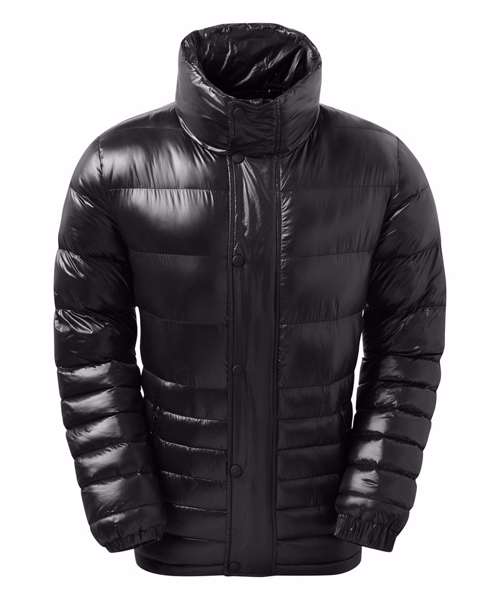 Wide external central storm flap with concealed coil zip, signature zip puller and internal storm flap with chin guard. Chunky rubberised stud fastenings on centre front. Horizontal stitched graded baffles. 245gsm polyester fill. Fully-lined in polyester matt finish. Self elasticated cuffs. Tonal coil zipped pockets with upper zip guard and self fabric piping around edges with rubberised edge trim. Glossy high shine face fabric. Internal double jet chest zipped reverse coil pocket. Product contains no branded neck label.* Removable Kimble or looped garment tags. Inner seam label holds important product information on one label with a second label containing brand information which can be cut-away.