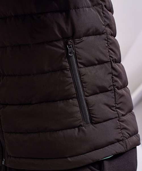 Reverse coil zip on centre front with recycled icon zip pull. Horizontal sandwiched narrow baffles on front and back body. Internal binding on all seams. Baffled three-panel hood, removable via zip attachment. Collar with chin guard. Lightweight polyester fill. Internal binding on all seams. Reverse coil zip pockets. Two inner pockets with hook and loop fastening. Product contains no branded neck label.* Removable Kimble or looped garment tags. Inner seam label holds important product information on one label with a second label containing brand information which can be cut-away.
