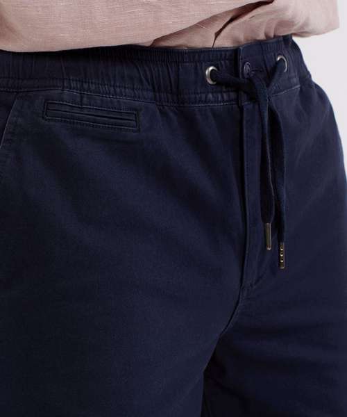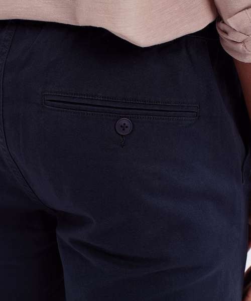 Two swing pockets and two back jet pockets with button fastening to one. Coin pocket. Elasticated waistband with drawstrings. Gunmetal eyelets and caps to drawstrings. Zip fly and button fastening to the front. Soft finish fabric. Shorts can be worn rolled up.