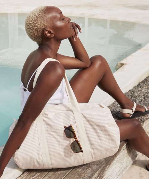 Whether it’s a trip to the beach, a session in the yoga studio or a long weekend at the spa, this relaxed barrel bag has a soft silhouette while also offering a spacious capacity for essentials and more. A subtle striped print adds a delicate pop of colour and a touch of rustic charm, while cotton carry handles have comfort well covered. Made from 100% certified organic cotton, this is another welcome step towards a more sustainable future and more conscious style choices.