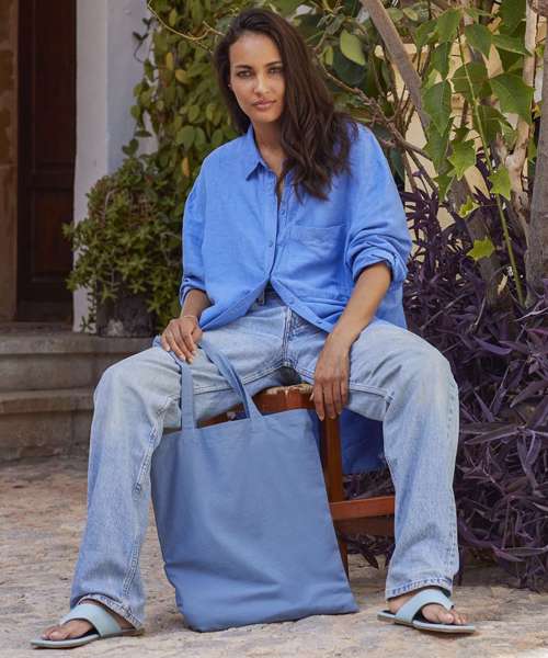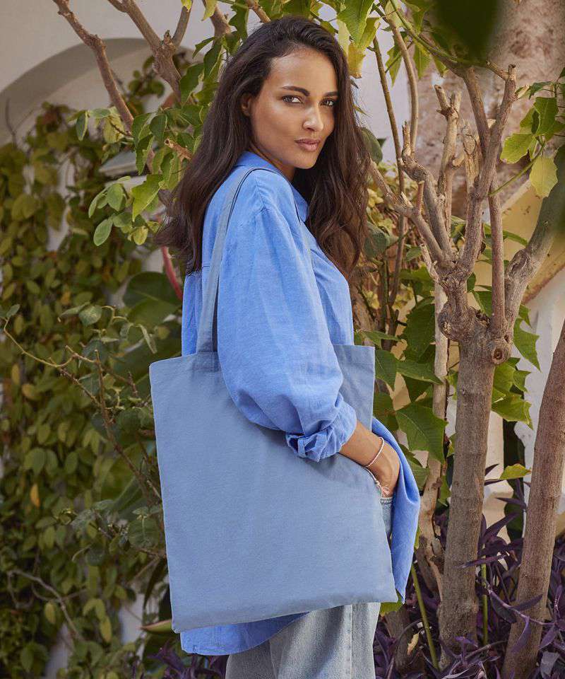 100% Organic cotton, 140gsm (4.1oz/yd²). Coloured with sustainably-derived natural dyes. Subtle variations in colour due to natural dyeing process. Fades beautifully over time. Can be carried by hand or over the shoulder. TearAway label for easy rebranding.