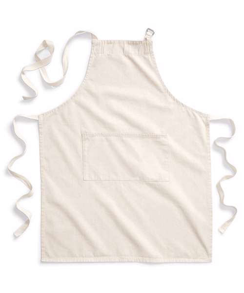 Full bib apron. Deep front pocket. Cotton Herringbone neck tie with sliding adjustable buckle. Cotton Herringbone 100cm waist ties. Fairtrade certified.