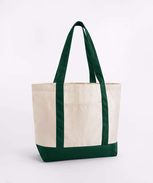 Premium heavyweight fabric. External slip pockets. Contrasting colour base and handles. Self-fabric carry handles. Can be carried by hand or over the shoulder. Contains 100% GOTS-certified organic cotton, certified by Control Union CU811033.