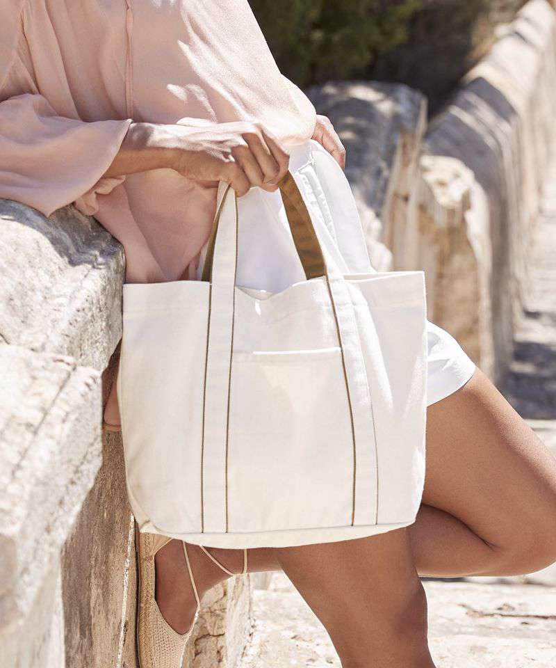 Contains 100% certified recycled cotton. Premium heavyweight fabric. Main compartment with magnetic closure. Hidden external slip pocket. Piped base panel. Handles with contrast detailing. Self-fabric carry handles. CutAway label for ease of rebranding.