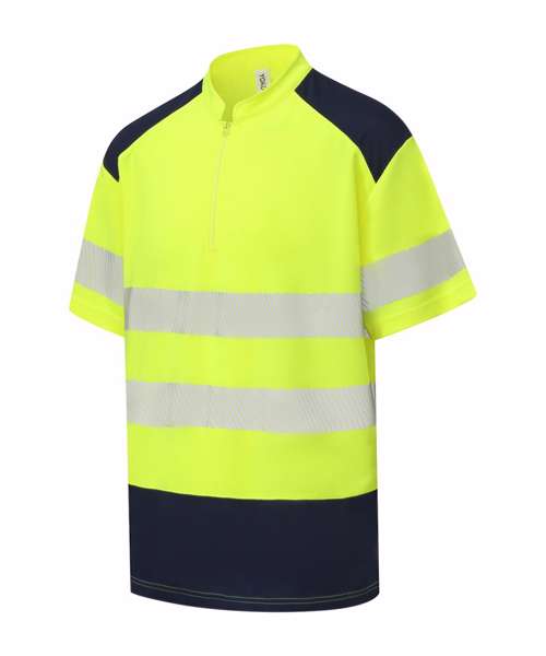 Conforms to EN ISO20471:2013 Class 2. Hi-vis Orange and Hi-vis Orange/Navy also conform to RIS-3279-TOM. Made of premium quality waffle piqué fabric from recycled polyester. Wearer-friendly zip neck with neat mandarin collar. Two 6cm-wide comfort reflective trims are heat-sealed around the body and one over each arm. Contrast navy shoulders. Relaxed fit. Twin-needle stitching. Split hem. Tag-free. Individually packed. Decoration-friendly. UV protection to UPF 40+.