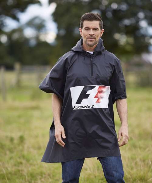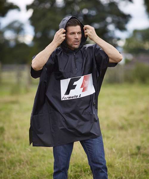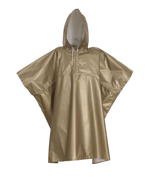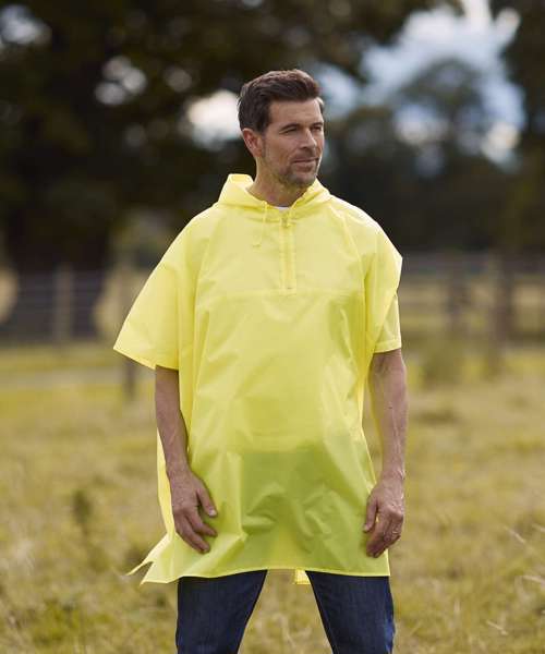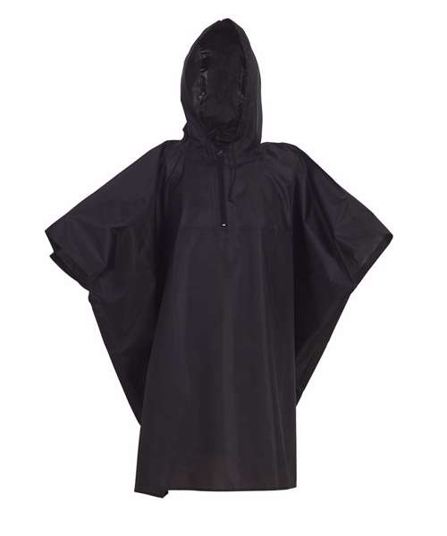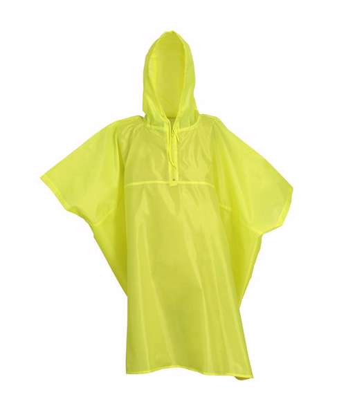 A great lightweight rain poncho packed in a self-fabric pouch. Made of PU coated polyester with inside stitched and taped seams. Large hood. Neck zip with drawstring. Extra space to cover bikes and backpacks. Logo decoration friendly.