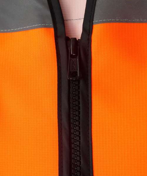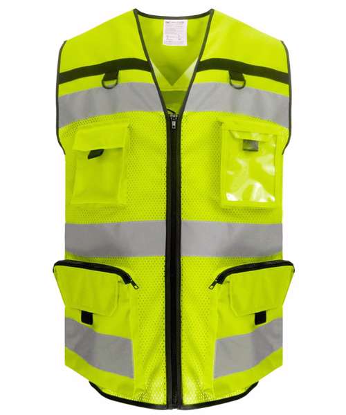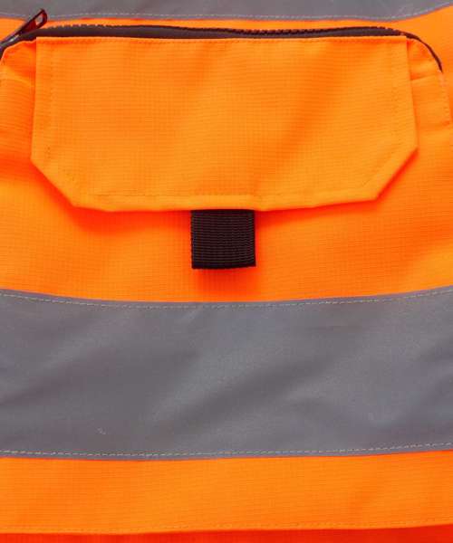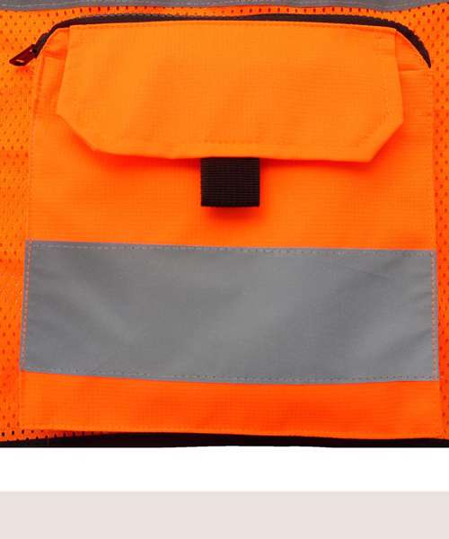 Heavy-duty, hi-vis ripstop tool vest with multiple pockets for convenience at work. Two double pockets accessed from the top with zip and hook and loop closure. Double D rings. Chest pockets with flap closure and pulls. ID card display. Adjustable hem with two press buttons. Also available with open mesh on the bottom to provide better breathability and comfort in hot working environments and seasons. Conforms to EN ISO20471:2013 Class 2. Large decoration area on the back. Certified Sedex and OEKO-TEX®.